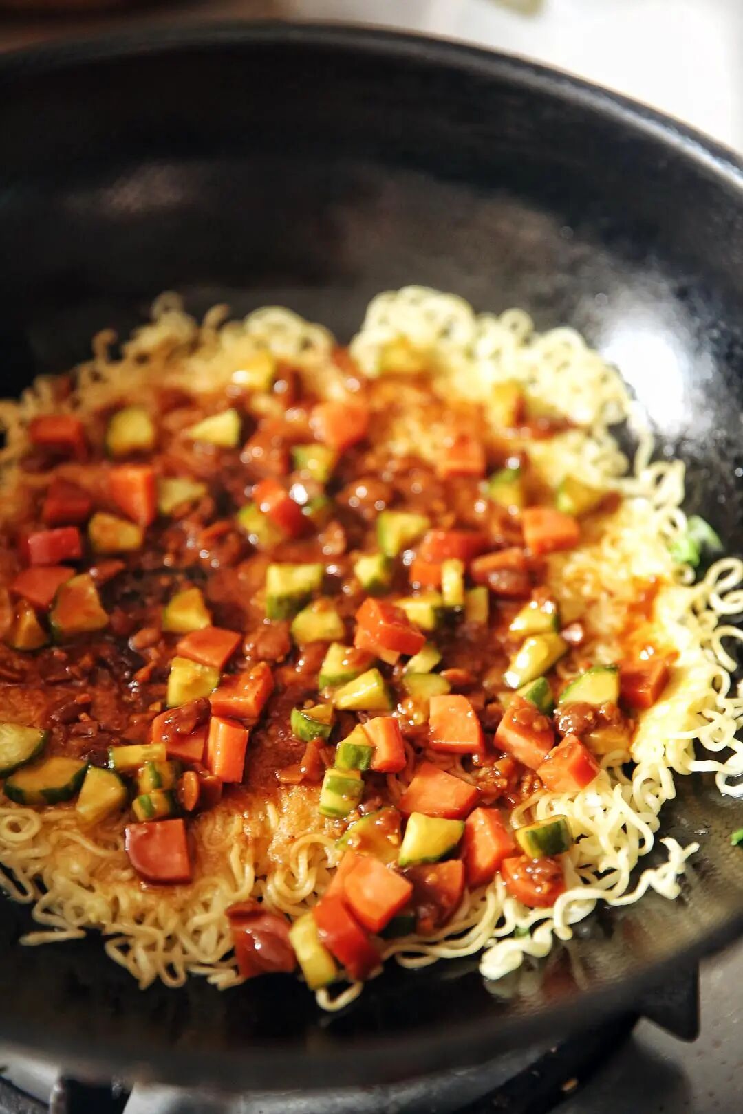 泡面只用面饼,用挂面也可以,夹的菜也随意,个人推荐黄瓜、生菜、熟土豆、熟豆芽、胡萝卜、香肠、培根;酱料建议用黄豆酱,我之前试过甜面酱,但还是黄豆酱的好吃。