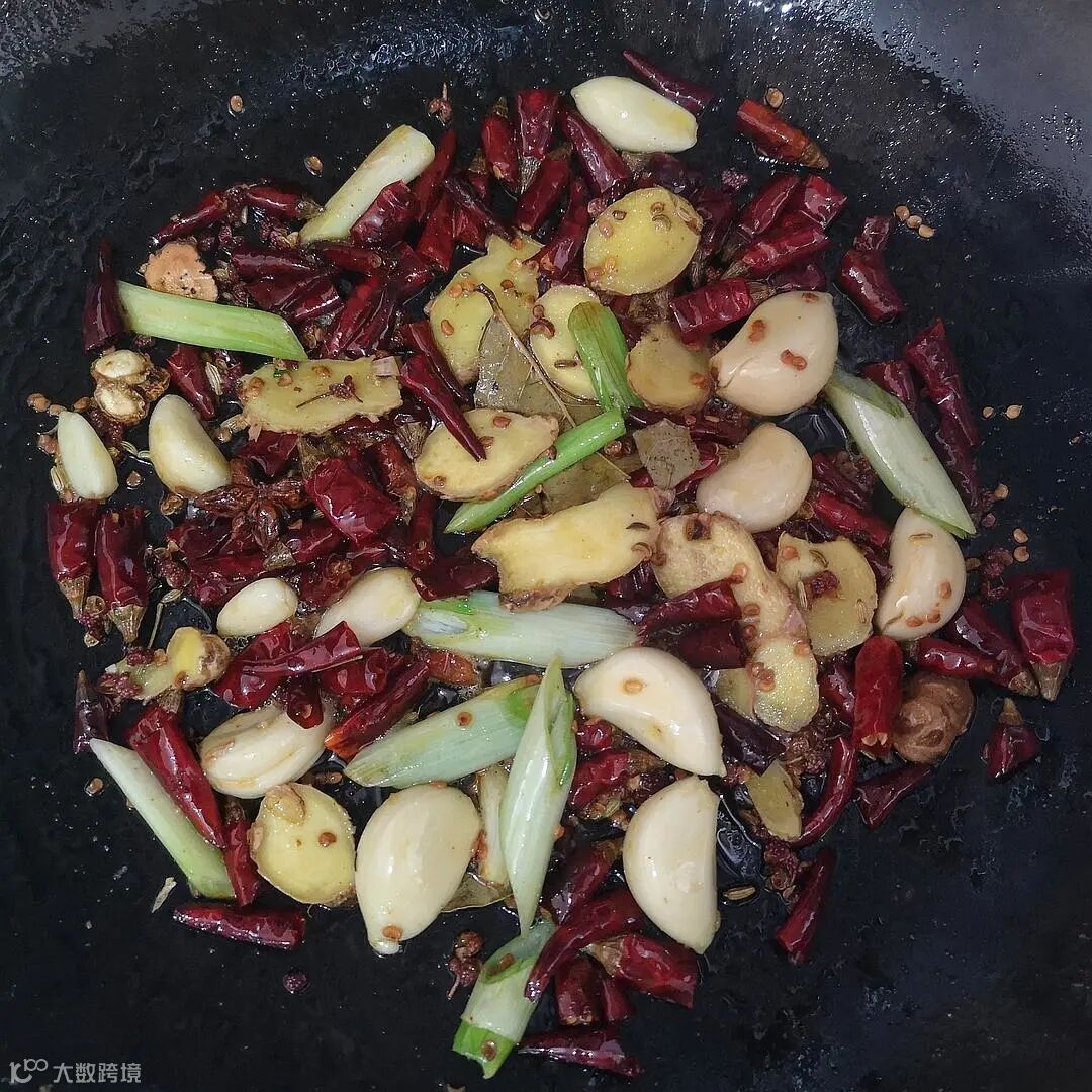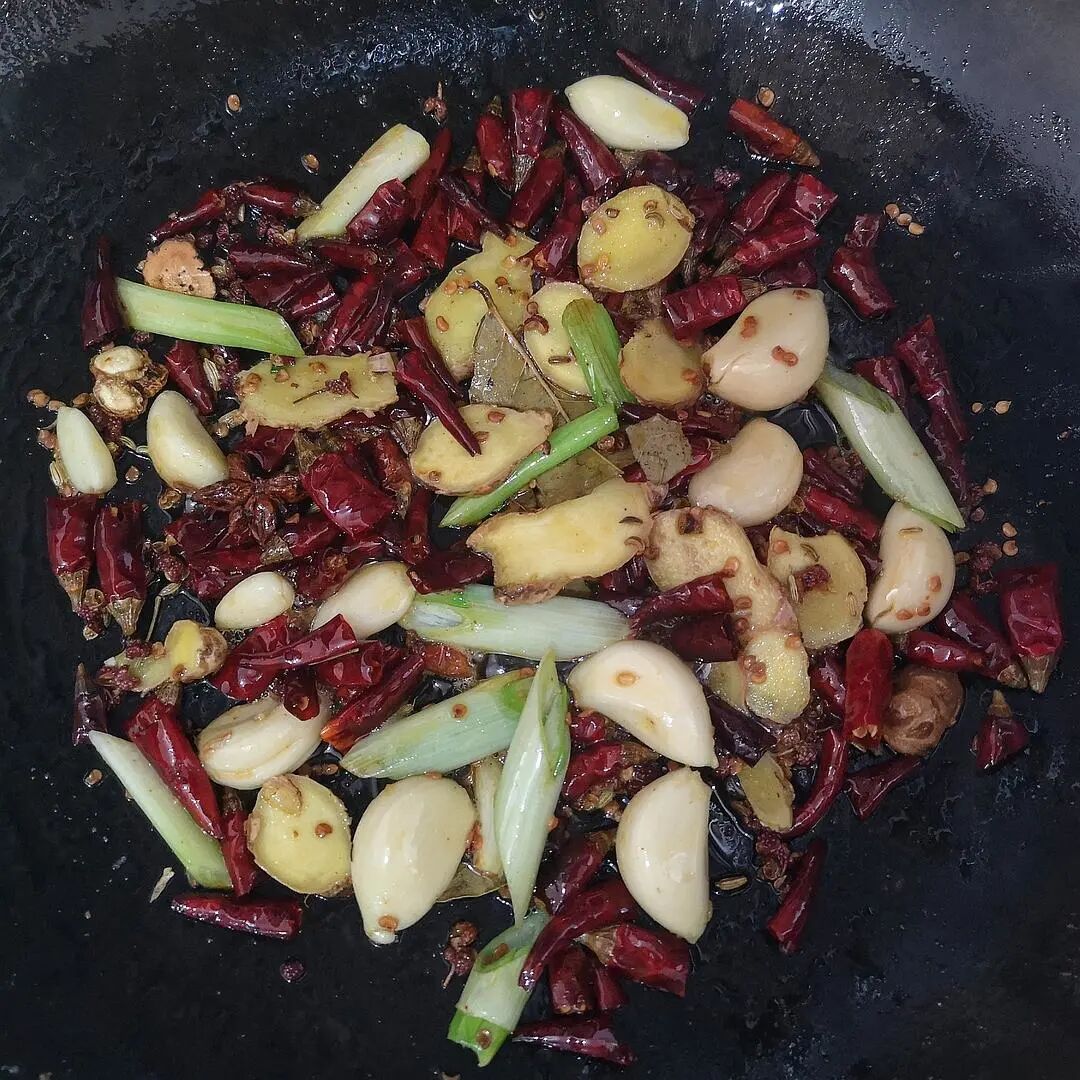 7.锅里剩一点油,小火炒佐料(辣椒+大蒜+花椒+大葱+一颗八角、山奈、香叶)
