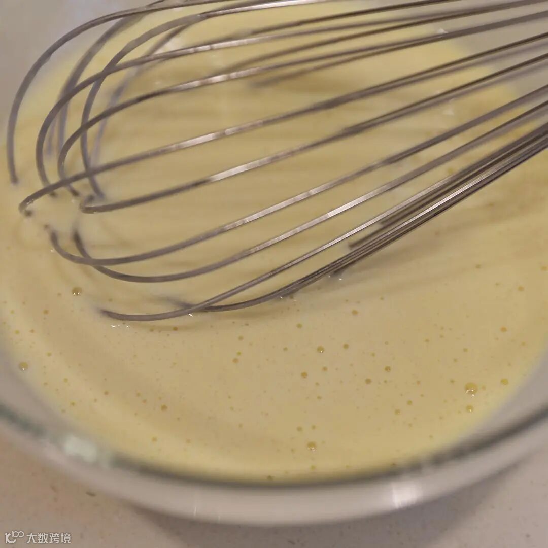 🔹将牛奶倒入鸡蛋中搅匀,过筛两遍