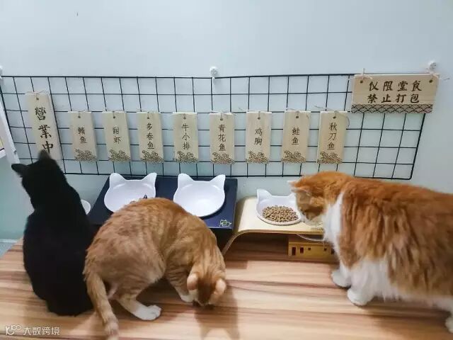 牌子是木制的,在淘宝上订做的那种最小的餐厅用的菜牌,可以随时取下来清洁和更换,也防止猫咪吃东西溅到墙上(毕竟大家吃相都emmmm)