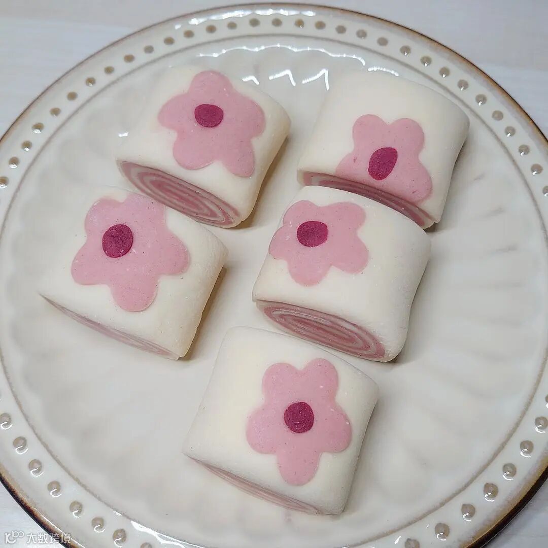 2、在最外面一层的面皮的一边,用不一样颜色的面团做出一个个花朵粘好后(取一小部分粉色的面团再加些红曲粉揉变成深红色做花心即可),用擀面杖擀平些(擀的时候记得别只是一个方向擀哦,要不然花朵就是横向生长了),这样印花就做好了,从没花朵的一边卷起来切就行。
