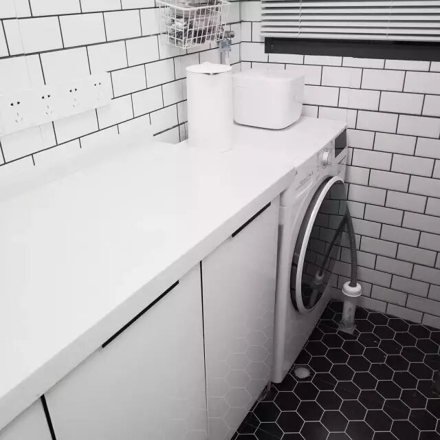 洗衣机上放了我每天需要用的水壶和电饭煲。电饭煲是最近才换的,以前的很丑我都搁橱柜,每次用拿出来,但是新买这个颜值高放这儿完全不影响。我真的是超看颜值,装房子之前本来就有整套的刀具,锅碗瓢盆等,但是我看不惯所以都陆陆续续换成了好看的(在我眼里纯白的就是好看的)。