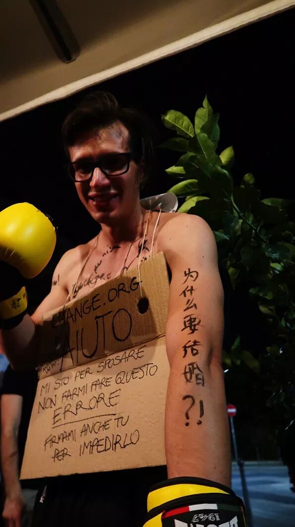 昨晚在路边喝酒,一群小伙子簇拥着一位赤膊准新郎,进行着嬉笑打闹的婚前游行,他们问路人有没有什么寄语劝他回头是岸,于是我随手写了一句中文。