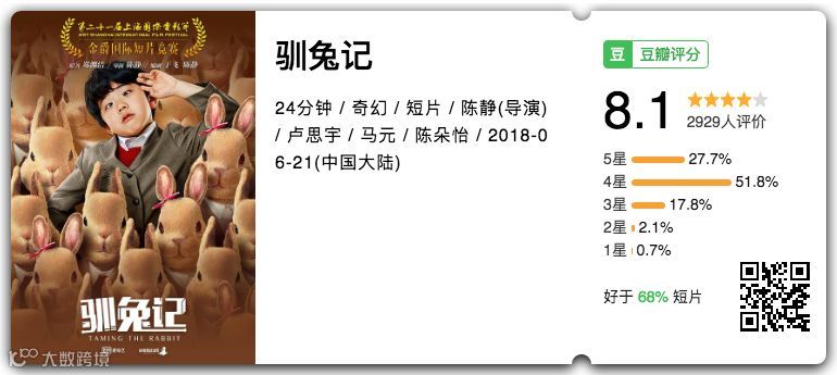 就是短片《驯兔记》,虽然全片只有24分钟,但豆瓣评分8.1。在同类短片,尤其国产作品中实属高分。