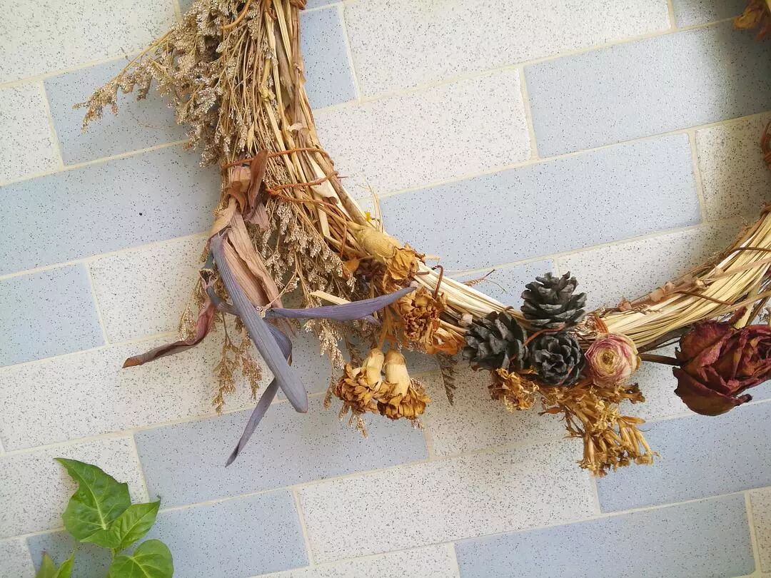 包粽子剩下的细叶,干掉的鲜花,枯萎的绿植,捡来的松果,绳子。