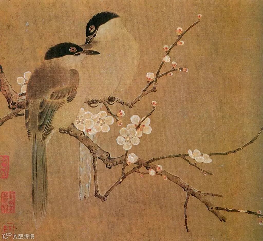 A 最大的差别是中西方对于空间的处理会不太一样。我在讲梅花画法的时候有讲到,中国人是用干、湿、浓、淡的方式来表示物体的质感,以及事物的空间关系的。比如说画花瓣的时候可能墨要加点水,墨色要淡一些,线条出来要润一些;然后到了树枝的那个地方呢,枝干本身它就会斑驳粗犷一些,然后用干笔,就可能会枯一些,它是用这种干湿来表达物体本身的不同质感。