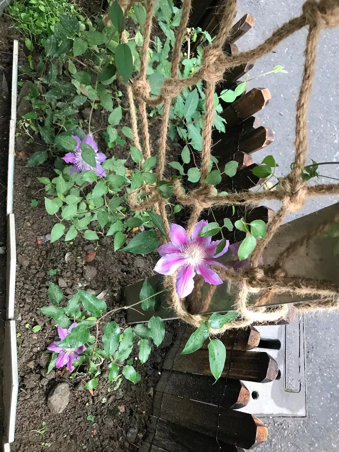 信箱的背面有点丑呀。想过刷漆,立马被自己否决。挂了麻绳爬藤网。铁线莲有地方爬了。