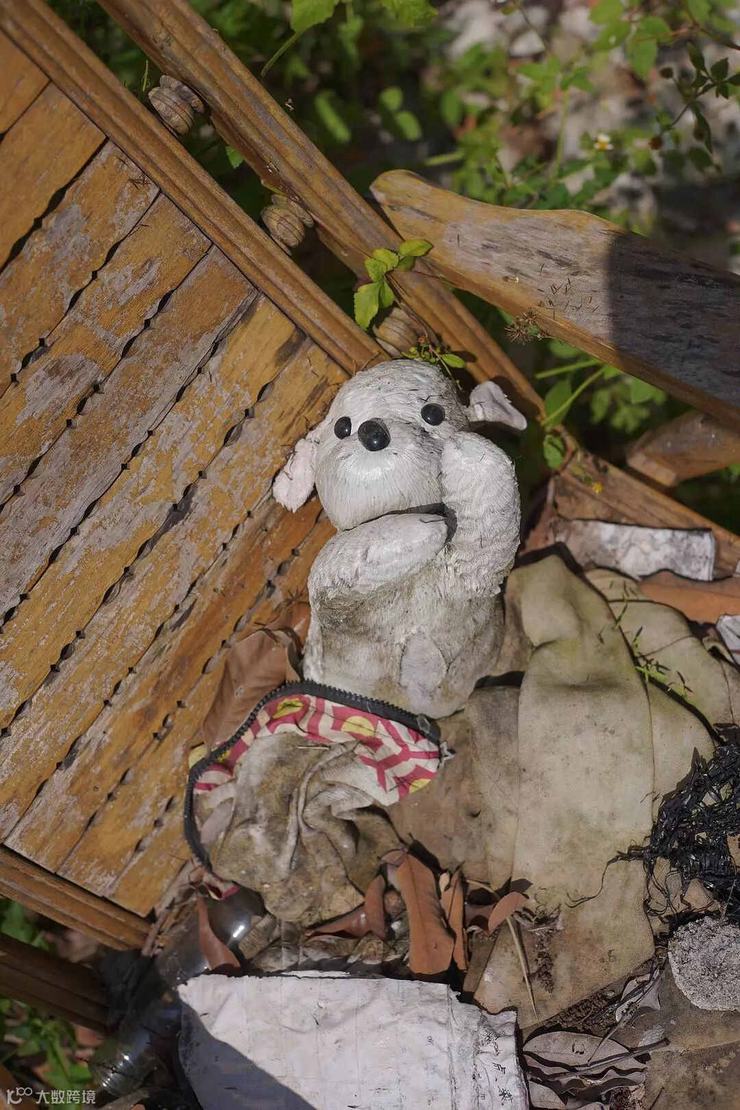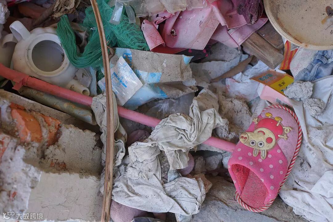 钓鱼玩具的窟窿里只剩瓦砾,另一只小猪佩奇半掩在破砖头之中: