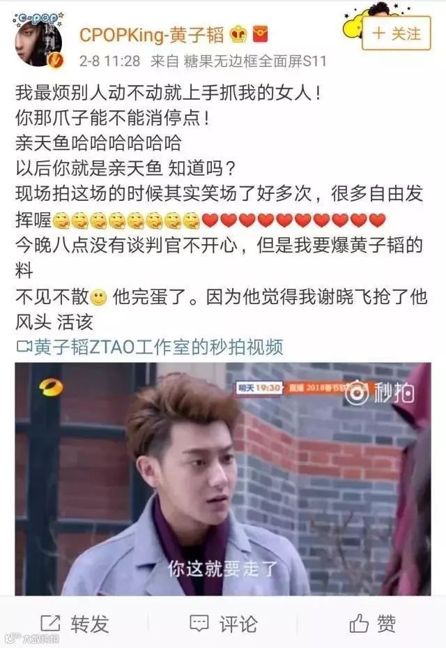 看这微博截图突然想起从前韬韬的微博名字叫“SwaggyT-ao”,后来才改成了“CPOPKing-黄子韬”,可以说每个名字都极其中二,不过倒也符合他,毕竟几亿零花钱在口袋