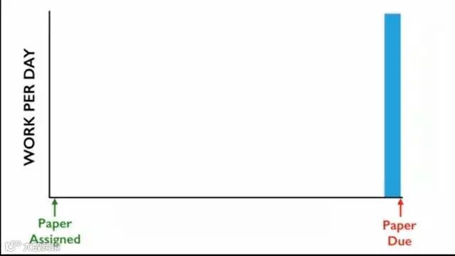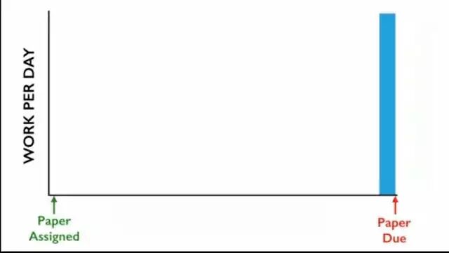 Tim Urban在大学的专业是政治学。为了更好地督促自己写毕业论文,他特地用柱状图制作了一份看起来很专业的写作计划。下面的横轴代表时间,他有12个月来完成论文的写作。蓝色的竖条方块表示的是他计划中每个月完成的工作量。