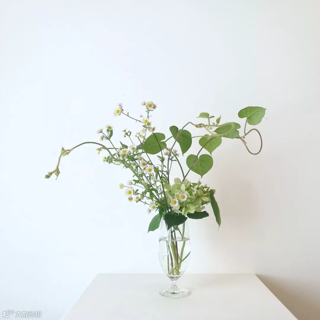 日用的容器,河边的野花草。花器是腐乳罐,藤小篮,酒杯,酸奶瓷瓶。花是鬼针草,狗尾草,牵牛花,一年蓬,山麦冬。