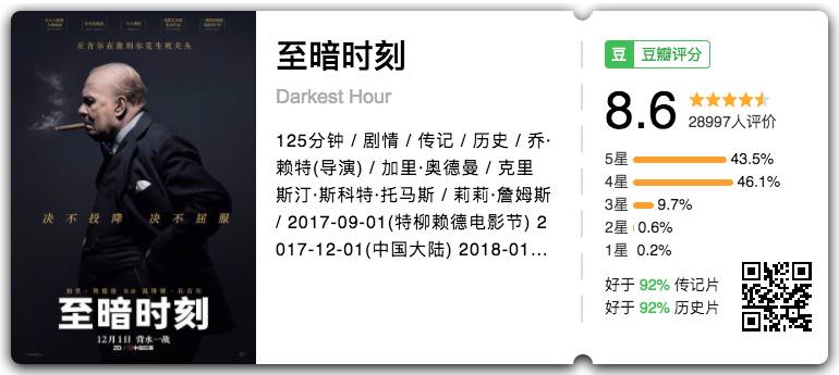 本周新上榜的《至暗时刻》以8.6的高分空降亚军,加里·奥德曼影帝级的演出是本片最大亮点,巧夺天工的化妆加上狗爹神乎其技的演绎,让这位剑拔弩张却也不断自我怀疑的的伟大政治家丘吉尔在镜头前重生。通篇室内对话场景却迸发出极强的情绪感染力,无论是表演还是制作,这部电影都可以说是传记类型里的高峰。