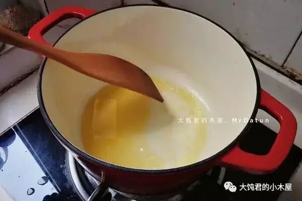 炖煮锅中开中火,放入黄油持续加热。随后放入大蒜末、洋葱来煸香。