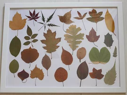 这张自上而下自左而右依次是:荚蒾,鸡爪槭,黄荆,枫香,某种槭,山楂,洋白蜡,核桃,玫瑰,两种栎树,某种槭,枸骨,流苏树,榛树,香樟,某种樱,柿树,粉花羊蹄甲,蕨,乌桕,椴树,黄栌,红瑞木,鹅掌楸,棣棠。这些叶子分别收集于北京、南京、乌镇、成都。