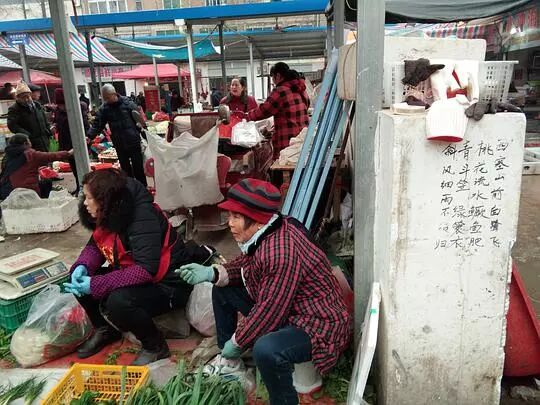 这几天阴雨绵绵,跟着母亲逛菜市场,她去鱼摊那边买鱼,我在这边买大葱和胡萝卜。一抬头忽然发现柱子上写着唐代张志和的《渔歌子》:“西塞山前白鹭飞,桃花流水鳜鱼肥。青箬笠,绿蓑衣,斜风细雨不须归。”倒是应景得很。