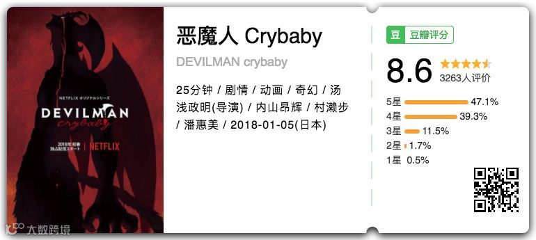 有西米:80%流淌着原作的血液。汤浅在这里的任务并不是融入过于丰富的个人风格,而是以影像形式深化并完美传达《恶魔人》的不朽魅力。《crybaby》成功做到了,刚开始可能无法理解这相比对通篇进行再演绎有多么重要,直到最后两集,你在荧幕前跟着角色一起,从悲愤,到号泣。