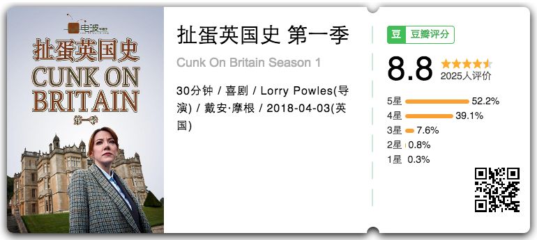 @吃蘑菇的喵酱 :戏谑调侃的方式将英国历史趣味解读,女主持一本正经的向受访嘉宾问着鬼话连篇天马行空的问题,受访者在遭受心理严重重创后还要尴尬得回复,每一集都是槽点满满,但每一集都能在槽点中get走马观花式的英史著名事件和名人,不愧是黑镜编剧操刀打造,满分。