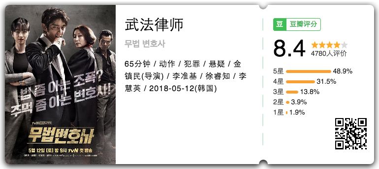 @二水Pauline:以前看到的李准基都是比较正派的或严肃的,没想到饰演有点痞气的律师也同样到位!出场就很吸引人,各种小表情运用的炉火纯青恰到好处!很棒~感觉画面色彩不像现在的诸多韩剧,很有复古的情怀,很多镜头场景竟有点老港片的风格,不知导演是不是喜欢老港剧~看的激动。