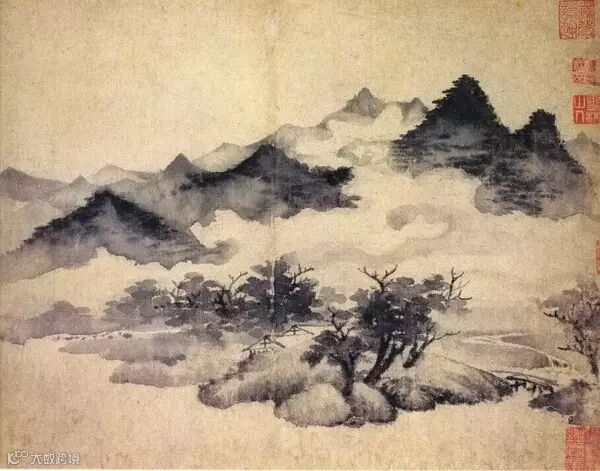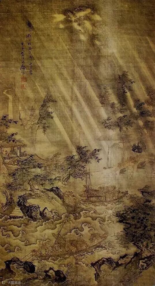 综上,我们可以看出来。除了第一种直接画出“雨”来的。或者第二种里,在画面提示中明显的用人物的雨具(雨伞,雨衣),像上面说的苏显荣的《风雨归舟》里表现的那种情况之外,后两种处理,其实提示的是经常和“雨”一块儿出现,可又不是雨的另两样事物。即——“风”和“云”。比如,夏圭那幅画里头吹横了的树叶,有人可能会提出来这样的问题:这可能就是刮大风了啊,不一定有雨啊。再比如,米氏云山那种风格,有人也会提出来,这就是空气湿度大,有云。可能是雨前,也可能在雨后,可不一定就在下雨的时候。