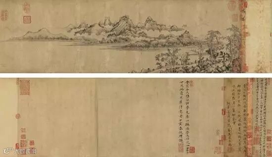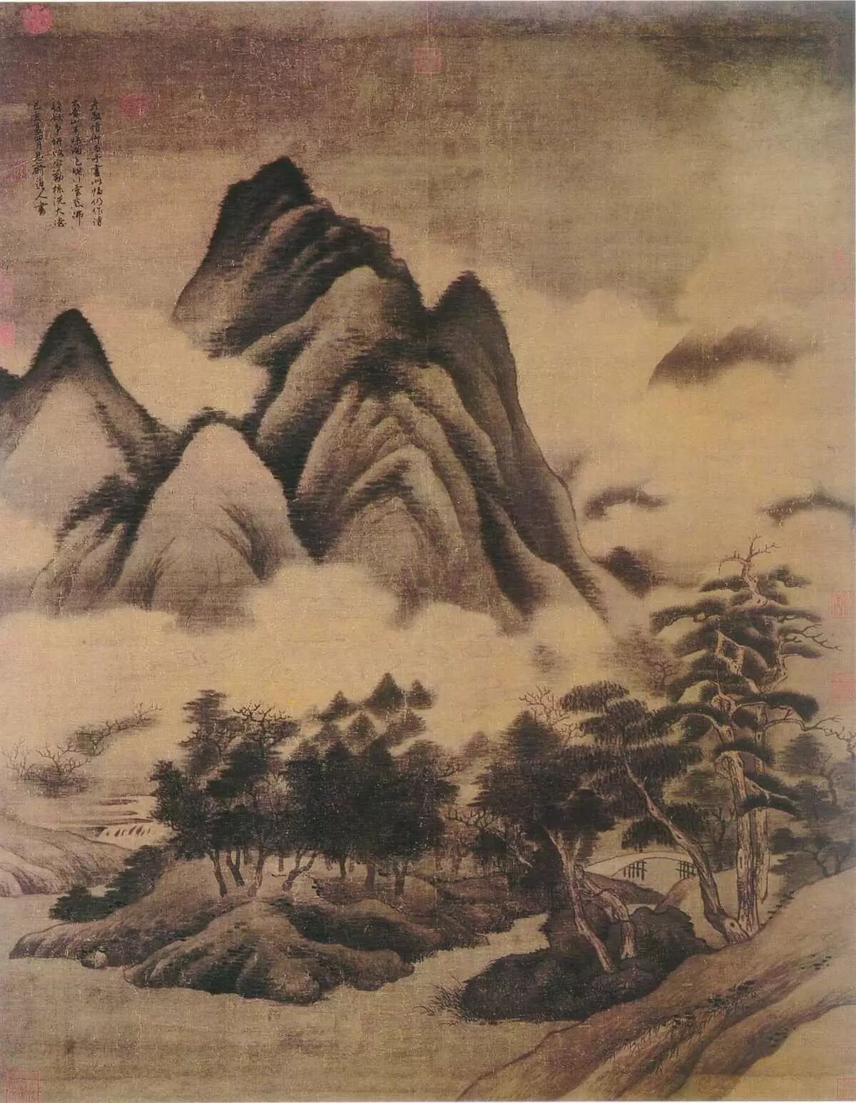就比如上面说到的,夏圭团扇中远处那种湿湿的,烟雾缭绕的山。借一个摄影圈儿老用的词,这是给人个“空气感”。传说米芾和他儿子米友仁创制的“米氏云山”,就是这种的代表。下面是据传为米芾的《云起楼图》。无论是不是吧。反正是所谓“米氏云山”的典型代表。大家可以直观感受一下。看不出风雨,至少看个空气湿度。