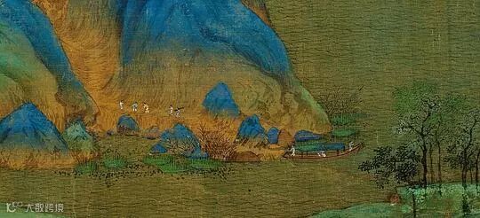 宋画细节惊人,可以充分细读。成阵的飞鸟;远方迷蒙的烟树颇似牧溪画风;各个细小但动作生动的小人儿——瀑布下的嬉戏、游船、山行、客来山居、闲谈、垂钓;山崖上居然还有一处放鹤台,两只丹顶鹤遥遥相望……真妙不可言。