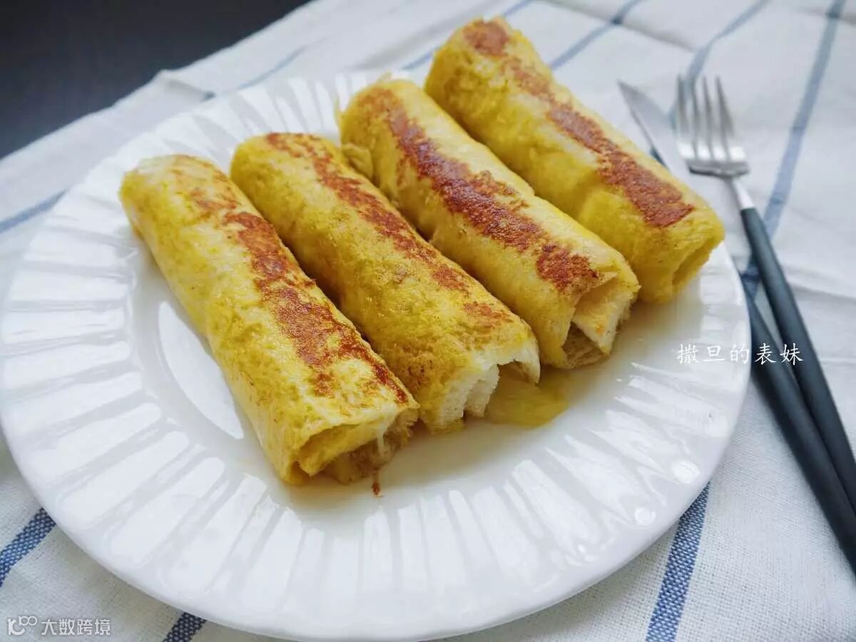 我图省事儿做了最简单版的,只用了吐司、鸡蛋和芝士,还可以加火腿、虾仁、肉松、金枪鱼等等咸味食材一起卷进去煎,味道更丰富,而且吃起来不会那么腻。