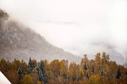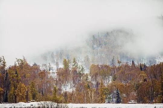 在大雪封路前下了山,沿路是层层叠叠的树。