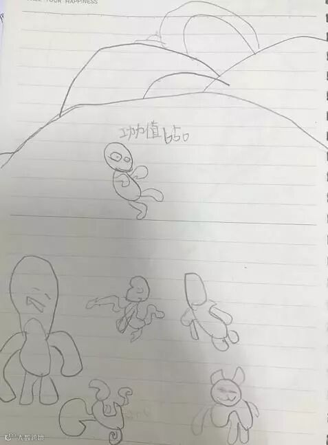 虽然这个穿着连体衣、只有两个扣子、五官不齐、手指缺失、跳跃姿势奇特的小人儿画的相当意识流,但看到这张纸上文字,我瞬间就感动了:孩子自己其实也希望自己能成为一个踏实学习的孩子,让家长开心。但希望毕竟是希望,孩子终究是孩子——我自己小时学习种种,比如在书本上指点江山挥斥方遒,回忆起来,亦不忍卒思,于是深感更无责怪的立场。