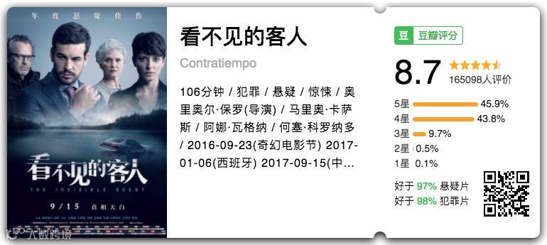 在内地院线全面上映后,西班牙悬疑电影《看不见的客人》果然登上了一周热门影视榜首。从年初网络热议到下半年院线热映,过硬的品质和变化莫测的剧情让口碑成为这部电影唯一也是强硬的宣传利器。