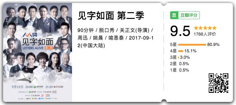《见字如面》第二季高分回归,上一季的高口碑带来了本季的财大气粗,嘉宾制作双重升级,不仅有何冰、归亚蕾等熟面孔继续坐镇,周迅、喻恩泰等人气演员的台词功底也可圈可点。第一期聚焦生死,频频泪目。可惜原定本周上线的第二期未能如约而至,不论原因为何,追更党实在等得浑身难受。