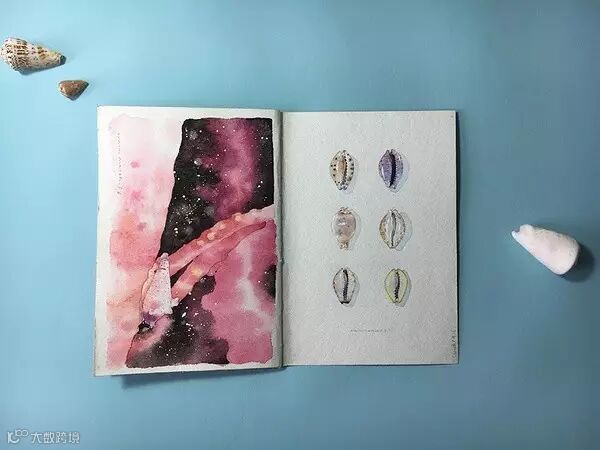 左页是在珊瑚上爬行的海兔,大小可能还不到15mm的海兔,和珊瑚,就是整个宇宙。远景画的不太满意。上次普吉岛亚洲贝壳聚会时,一个比利时大贝商说想要收藏这幅画,可是。。我不能把本子撕下一页啊。右页是宝螺,我平时不太喜欢宝螺,但是这个本子里我画的最后一张,还是画的小心翼翼,格外细致。其实。。宝螺还是挺好看的。这个纸也还是挺好用的,虽然当年是6块钱半开,换算成现在,也得要20块半开了吧?