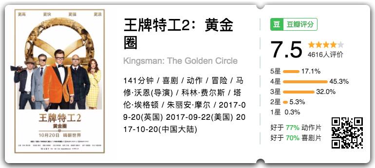 《看不见的客人》超高评分内地上映后本周继续蝉联一周热门影视冠军。评分从8.0略跌至7.9但本周热度依然,国产动画《大护法》上映近三个月后人气大涨,占据第二名的位置。本周内地新上映的好莱坞动作喜剧《王牌保镖》位列第三,瑞恩雷诺兹和塞缪尔杰克逊联手耍贱成为吸睛利器。