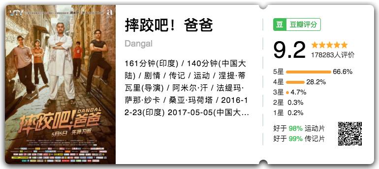 印度神片《摔跤吧!爸爸》口碑持续爆棚,不光在票房上实现逆袭,更是蹿升至电影榜单首位。在印度这个男权颜色极为浓厚的国度,这部影片以体育传记为载体,记录着父亲下狠心苦心栽培两个女儿成为优秀的摔跤手,同时向世人展示着男女平等之期望。阿米尔·汗太敬业了,为了一闪而过的几秒就把自己的身材从肥胖练成魔鬼,好演员都是用生命在演戏啊!