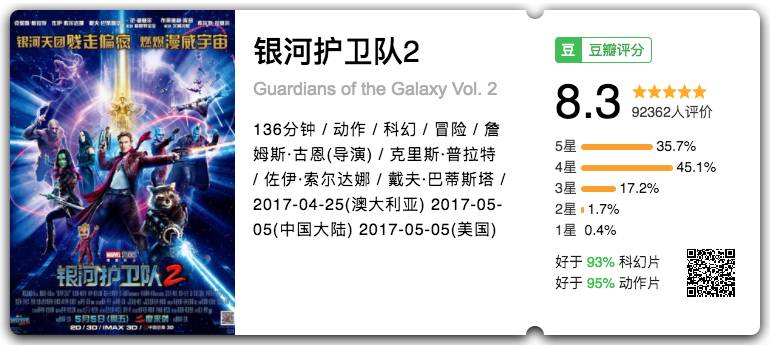 2017年第19周,《银河护卫队2》毫无悬念占领电影榜首位,印度影片《摔跤吧!爸爸》以9.2的高分紧随其后;美剧《超感猎杀》第二季一次性发出10集强势回归,成为本周电视剧榜冠军;综艺榜大家轮流坐庄,本周轮到《花儿与少年》夺冠。