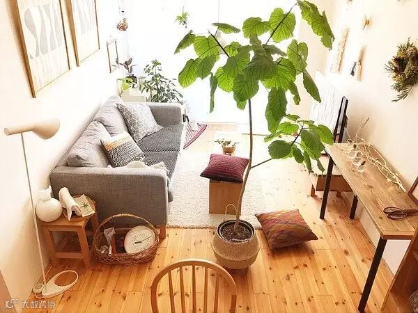 逛花卉商场的时候,建议先购买大棵的植物,再挑选小盆栽。对于懒人来说,大棵植栽的生命力相对更强一些,比较容易照顾,放在小空间中也更容易出彩。比如下图的客厅,抱枕、挂画、灯和装饰都齐全了,看起来不错,但总觉得还差点什么▼