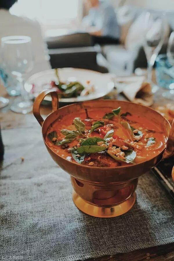 我这次做的汤有点重口味,把烤鸭店里带回的烤鸭,用泰式的红咖喱酱和椰浆水来熬了个咖喱浓汤。里面还加了腰果碎,泰式小茄和罗勒叶。浓郁辣味的汤足可以让宾客打开味蕾,敞开肚量。