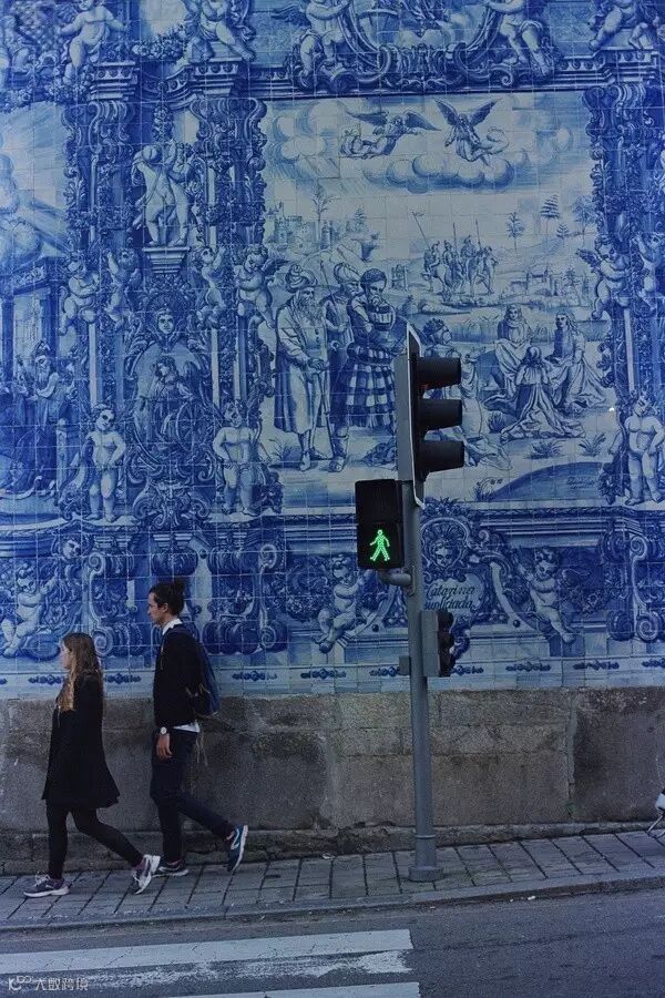 马路对面的情侣,身侧的圣灵教堂外部被青花瓷砖所覆盖,蓝白绘圣人生平。