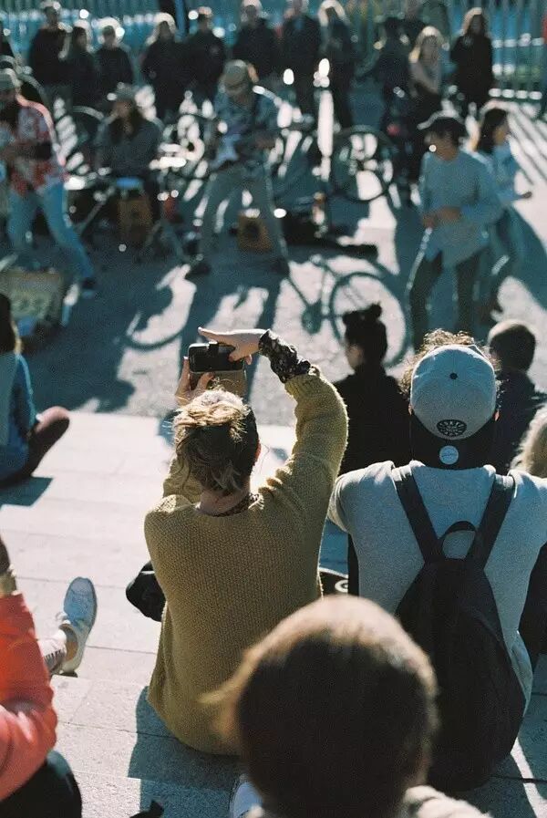 靠近海边的广场,乐队奏得曲子活泼又欢快,表演也很逗趣,只是要迎着日光看演出,没戴墨镜有些难过。一曲结束后,男生下去买了一张乐队的碟,回来递给女生,然后伸手拉她起来,看着女生很高兴地把碟放进帆布包里,一手夹起滑板,一手牵起她,朝另一边走了。