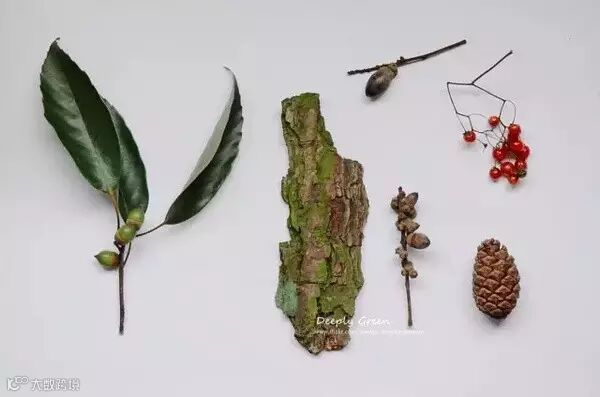 在我的自然收集物里,这些植物都很常见。树皮、松针、喜树果实、苦楝果实等都是捡的。