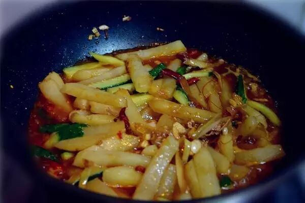 6.待土豆条外皮炒成金黄色时,放入黄瓜,炒2分钟,盛出,剩下的油留在锅中。
