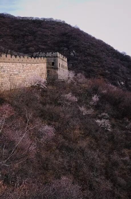 北京城里此时草长莺飞,花红柳绿,一派热闹的春景。山上初看仍是冬天的模样,城墙背阴处积有未化的残雪。举目远眺,天色明朗,连绵不断的野长城如巨龙般盘踞在山的脊梁上,枯树间偶有刚开的粉白色山桃星星点点缀于其中,再过半月待山桃全部开放不知该有多壮观,长城大概是最能体现北方美学的景观了。