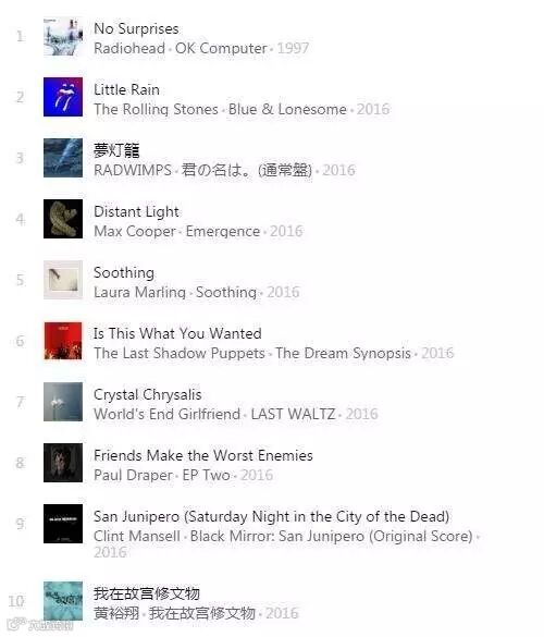 推荐:著名作曲家 Ramin Djawadi 为这部大热美剧担当配乐,原声 34 首作品不仅包含了 Soundgarden, the Animals, Amy Winehouse, the Cure 等艺术家作品的改编版本,作为 Radiohead 的超级粉丝,Ramin Djawadi 更是把 "No Surprises", "Fake Plastic Trees", "Motion Picture Soundtrack", "Exit Music (For a Film)" 这四首经典之作完美地融入剧中。毫无疑问,除了脑洞编剧给剧情带来的神转折之外,“宇宙天团” Radiohead 本身歌曲的魔力也令这部剧增色不少,究竟什么是真实,什么是虚幻,每个人都有自己的答案。