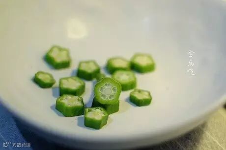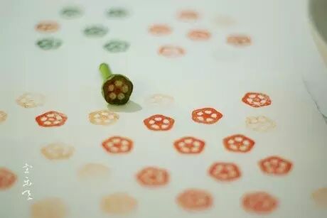 秋葵果子的横截面是梅花形状,切完后不要的果蒂可以当印章用: