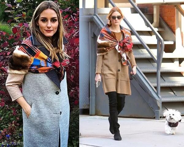Olivia Palermo很喜欢把鲜艳的围巾系在大衣外面: