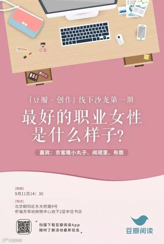 我们邀请到京客隆小丸子、闻珺里、有鹿三位嘉宾,来做这场线下分享。她们背景不同,却同样身兼职业女性&豆瓣阅读作者身份,她们将与大家一起分享身为职业女性的种种经历,描述她们心中最好的职业女性状态。