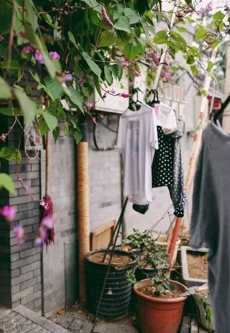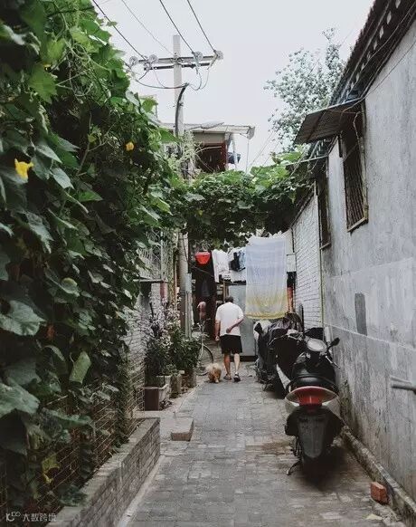入秋一个月了,路边的银杏开始泛黄,胡同里仍是绿油油一片。葫芦、丝瓜、倭瓜和紫豆角的藤蔓乱蓬蓬地冲天长,爬到电线上,覆了半面墙,遮了原本涂在墙上的拆字。十多寸长的丝瓜和硕大的葫芦肆意地结在藤上,之前开的黄花谢了,落了一地,墙角边开着茑萝、牵牛花和紫茉莉,破败的墙体成了植物的城堡。