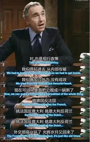 剧中Humphrey的台词极其精辟,随便整理下,都是英国新闻联播级别的梗。其中他有段话,准确的分析了英国为啥奉行光荣孤立政策,甚至预测到如今的场景:“英国的外交政策500年来没有变过,创造一个分裂的欧洲。因此,我联荷兰联手制西班牙,和德国制法国,联法国和意大利制德国,联法国制德国和意大利。分而治之,您看,一贯效果很好,为什么要改变。过去有效,现在也是如此。我们得分裂欧共体,我们施加过外力,没有效果。现在我们就加入欧共体,从里面把它搅成一锅粥。可以挑德国反法国,挑法国反意大利,挑意大利反荷兰。外交部高兴坏了,光辉岁月又回来了。”
