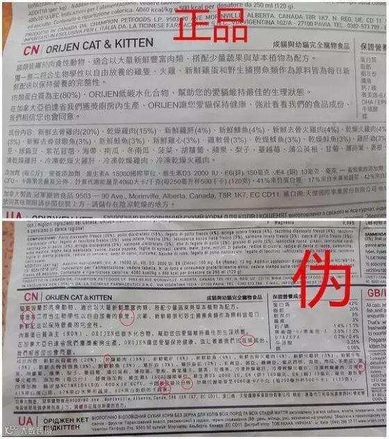 1、包装材质:假猫粮体现在包装印刷上,材质已经很像了,但手感还是有不同;