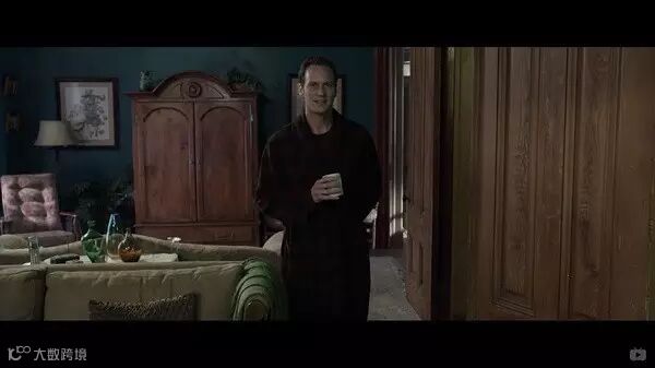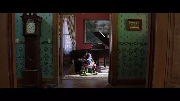 她的假丈夫,被派克的死灵占据肉身之后的乔希,神色异常、肉身正在腐烂。乔希显得憔悴和无力。在下面的这个镜头中,微笑的乔希如此令人不安,注意他身后木质门板和桌面上闪烁的莹莹绿光。