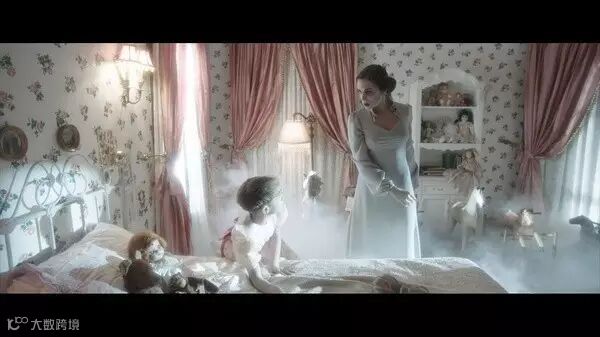 下面这个画面显然笼罩了一层白纱般的滤镜,这里不仅是死界,更深入到了恶灵派克·柯蓝的深层记忆中,关于他母亲对他的控制和扭曲。这些画面带了飘渺和模糊,象征是非实体的回忆。母亲凶狠的脸位于整个画面的视觉焦点处,邪恶又暴戾的她才是镜头表达的重点。